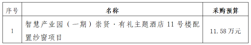 一、采購項(xiàng)目名稱:智慧產(chǎn)業(yè)園(一期)崇賢·有禮主題酒店11號(hào)樓配置紗窗項(xiàng)目