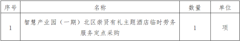 一、采購項目名稱:智慧產業(yè)園(一期)北區(qū)崇賢有禮主題酒店臨時勞務服務定點采購