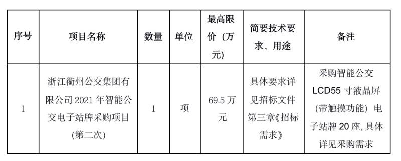 項(xiàng)目名稱:浙江衢州公交集團(tuán)有限公司2021年智能公交電子站牌采購項(xiàng)目(第二次)