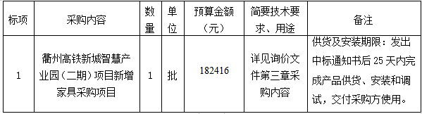 參照《中華人民共和國政府采購法》、《政府采購貨物和服務(wù)招標(biāo)投標(biāo)管理辦法》等規(guī)定,衢州市智信工程咨詢有限公司受衢州市智慧產(chǎn)業(yè)投資發(fā)展有限公司的委托,就衢州高鐵新城智慧產(chǎn)業(yè)園(二期)項(xiàng)目新增家具采購項(xiàng)目進(jìn)行詢價,本項(xiàng)目為非依法必招項(xiàng)目,現(xiàn)請合格供應(yīng)商參加投標(biāo)。