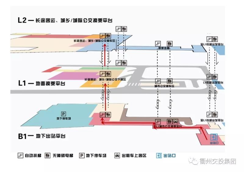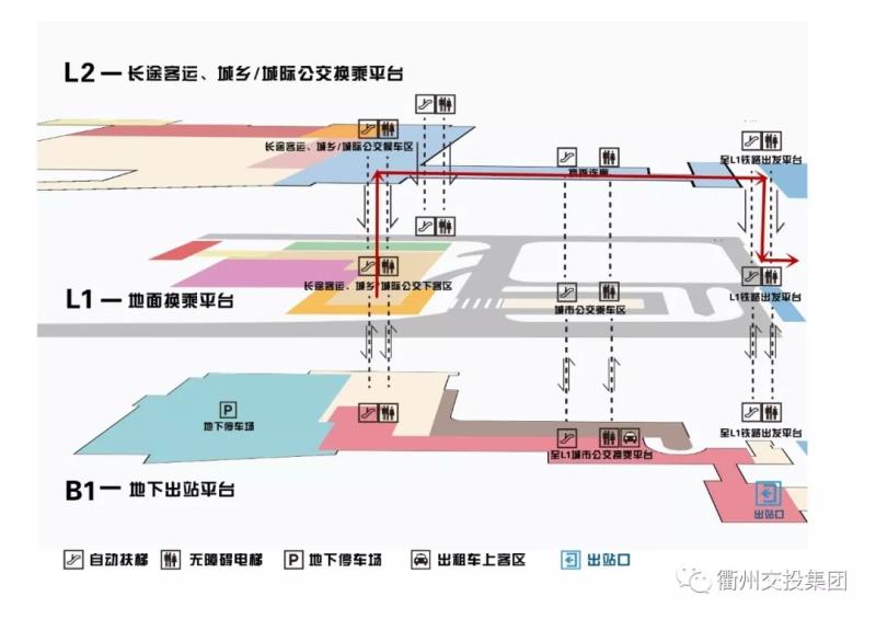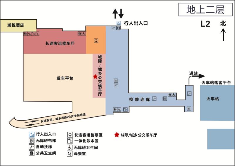 抵達地面一層城鄉(xiāng)/城際公交下客區(qū)——乘坐自動扶梯或無障礙電梯前往二樓——右轉后由西向東步行通過換乘連廊——抵達盡頭后乘坐自動扶梯或無障礙電梯向下——右轉至鐵路出發(fā)平臺。