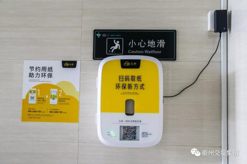 公共衛(wèi)生間內(nèi)設置了自助取紙機,只要使用手機微信掃描二維碼關注微信公眾號后,便可免費獲取紙巾。