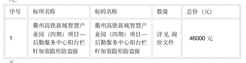 二、項(xiàng)目名稱:衢州高鐵新城智慧產(chǎn)業(yè)園(四期)項(xiàng)目—后勤服務(wù)中心陽(yáng)臺(tái)欄桿加裝隱形防盜窗