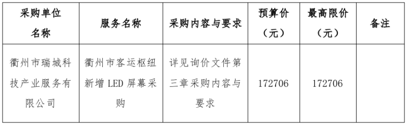 根據(jù)《衢州市國有企業(yè)采購管理辦法(試行)》規(guī)定并參照《中華人民共和國招標(biāo)投標(biāo)法》、《中華人民共和國政府采購法》等有關(guān)規(guī)定,衢州市兩山工程咨詢管理有限公司受衢州市瑞城科技產(chǎn)業(yè)服務(wù)有限公司的委托,對衢州市客運(yùn)樞紐新增LED屏幕進(jìn)行詢價采購,歡迎準(zhǔn)時參加。