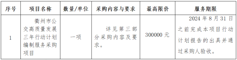 受浙江衢州公交集團(tuán)有限公司委托,現(xiàn)就衢州市公交高質(zhì)量發(fā)展三年行動(dòng)計(jì)劃編制服務(wù)采購(gòu)項(xiàng)目進(jìn)行采購(gòu)。本項(xiàng)目以競(jìng)爭(zhēng)性磋商方式進(jìn)行采購(gòu),歡迎合格的供應(yīng)商參加。