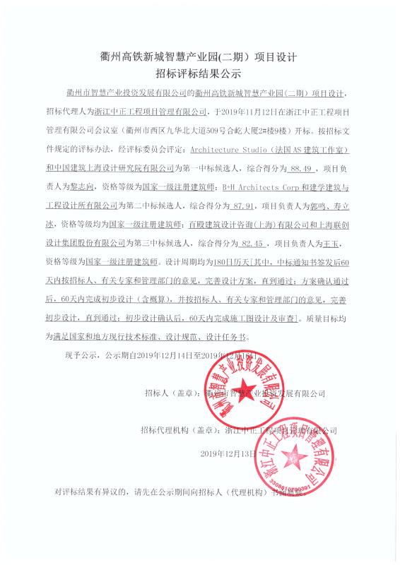 衢州市智慧產(chǎn)業(yè)投資發(fā)展有限公司的衢州高鐵新城智慧產(chǎn)業(yè)園(二期)項(xiàng)目設(shè)計(jì),招標(biāo)代理人為浙江中正工程項(xiàng)目管理有限公司,于2019年11月12日在浙江中正工程項(xiàng)目管理有限公司會(huì)議室(衢州市西區(qū)九華北大道509號(hào)合屹大廈2#樓9樓)開(kāi)標(biāo)。按招標(biāo)文件規(guī)定的評(píng)標(biāo)辦法,經(jīng)評(píng)標(biāo)委員會(huì)評(píng)定:Architecture Studio(法國(guó)AS建筑工作室)和中國(guó)建筑上海設(shè)計(jì)研究院有限公司為第一中標(biāo)候選人,綜合得分為 88.49 ,項(xiàng)目負(fù)責(zé)人為黎志向,資格等級(jí)為國(guó)家一級(jí)注冊(cè)建筑師;B+H Architects Corp和建學(xué)建筑與工程設(shè)計(jì)所有限公司為第二中標(biāo)候選人,綜合得分為 87.91,項(xiàng)目負(fù)責(zé)人為郭鳴、壽立冰,資格等級(jí)均為國(guó)家一級(jí)注冊(cè)建筑師;百殿建筑設(shè)計(jì)咨詢(上海)有限公司和上海聯(lián)創(chuàng)設(shè)計(jì)集團(tuán)股份有限公司為第三中標(biāo)候選人,綜合得分為 82.45 ,項(xiàng)目負(fù)責(zé)人為王玉,資格等級(jí)為國(guó)家一級(jí)注冊(cè)建筑師。設(shè)計(jì)周期均為180日歷天[其中,中標(biāo)通知書(shū)簽發(fā)后60天內(nèi)按招標(biāo)人、有關(guān)專家和管理部門(mén)的意見(jiàn),完善設(shè)計(jì)方案,直到通過(guò);方案確認(rèn)通過(guò)后,60天內(nèi)完成初步設(shè)計(jì)(含概算),并按招標(biāo)人、有關(guān)專家和管理部門(mén)的意見(jiàn),完善初步設(shè)計(jì),直到通過(guò);初步設(shè)計(jì)確認(rèn)后,60天內(nèi)完成施工圖設(shè)計(jì)及審查]。質(zhì)量目標(biāo)均為滿足國(guó)家和地方現(xiàn)行技術(shù)標(biāo)準(zhǔn)、設(shè)計(jì)規(guī)范、設(shè)計(jì)任務(wù)書(shū)。