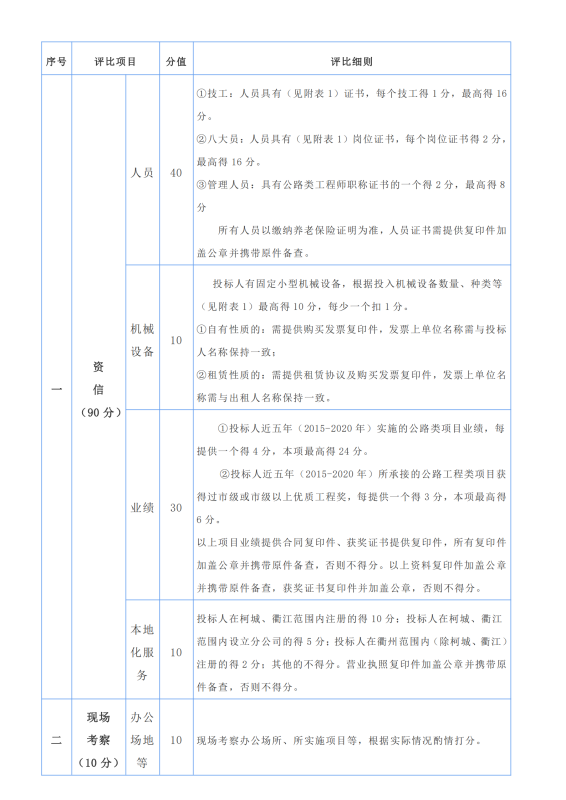 本次評比采用綜合評分法。評標專家對滿足招標文件要求的投標文件按評分標準打分,并按得分由高到低順序入圍,評分相等時,則現(xiàn)場抽簽確定排名順序。資信分90分,考察評價10分,總分100分。