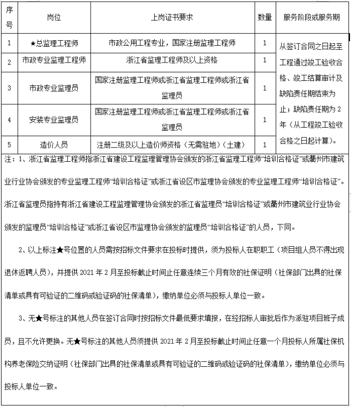 要求具備有效的國家注冊(cè)監(jiān)理工程師證書,注冊(cè)專業(yè)為市政公用工程。【國家注冊(cè)監(jiān)理工程師:衢州市區(qū)(含市本級(jí)、柯城區(qū)、衢江區(qū)、西區(qū)、綠色產(chǎn)業(yè)集聚區(qū),余同)外不得有在建工程的監(jiān)理業(yè)務(wù)(含已中標(biāo)工程或?yàn)榈谝恢袠?biāo)候選人的監(jiān)理業(yè)務(wù),余同),衢州市區(qū)不得有2個(gè)在建工程的監(jiān)理業(yè)務(wù)】。