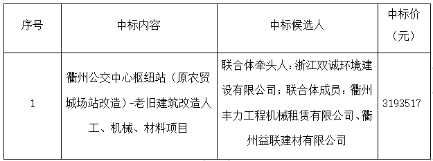 根據(jù)《中華人民共和國(guó)招標(biāo)投標(biāo)法》等有關(guān)法律法規(guī)的規(guī)定,浙江建安工程管理有限公司受浙江衢交建設(shè)工程有限公司委托,對(duì)其衢州公交中心樞紐站(原農(nóng)貿(mào)城場(chǎng)站改造)-老舊建筑改造人工、機(jī)械、材料項(xiàng)目采用公開招標(biāo)方式進(jìn)行招標(biāo)。浙江建安工程管理有限公司于2021年6月16日09時(shí)30分在衢州市交通投資集團(tuán)二樓開標(biāo)廳(衢州市柯城區(qū)白云街道花園中大道86號(hào))進(jìn)行開評(píng)標(biāo)。評(píng)標(biāo)結(jié)果及相關(guān)事宜現(xiàn)公示如下: