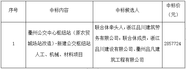 根據(jù)《中華人民共和國招標(biāo)投標(biāo)法》等有關(guān)法律法規(guī)的規(guī)定,浙江建安工程管理有限公司受浙江衢交建設(shè)工程有限公司委托,對(duì)其衢州公交中心樞紐站(原農(nóng)貿(mào)城場站改造)-新建公交樞紐站人工、機(jī)械、材料項(xiàng)目采用公開招標(biāo)方式進(jìn)行招標(biāo)。浙江建安工程管理有限公司于2021年6月17日09時(shí)30分在衢州市交通投資集團(tuán)二樓開標(biāo)廳(衢州市柯城區(qū)白云街道花園中大道86號(hào))進(jìn)行開評(píng)標(biāo)。評(píng)標(biāo)結(jié)果及相關(guān)事宜現(xiàn)公示如下: