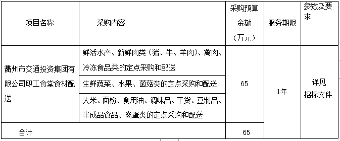 參照《中華人民共和國政府采購法》、《政府采購貨物和服務(wù)招標(biāo)投標(biāo)管理辦法》等規(guī)定,浙江中信工程咨詢有限公司受衢州市交通投資集團(tuán)有限公司委托,就衢州市交通投資集團(tuán)有限公司職工食堂食材配送采購項(xiàng)目進(jìn)行公開招標(biāo),歡迎國內(nèi)合格的供應(yīng)商前來投標(biāo)。