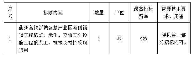二、項(xiàng)目名稱:衢州高鐵新城智慧產(chǎn)業(yè)園南側(cè)輔道工程路燈、綠化、交通安全設(shè)施工程的人工、機(jī)械及材料采購(gòu)項(xiàng)目