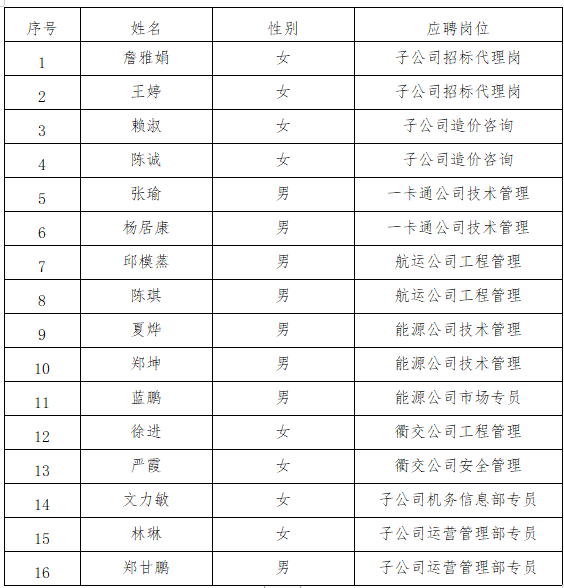 根據(jù)《衢州市交通投資集團(tuán)有限公司招聘公告》要求,現(xiàn)將擬錄用人員名單公示如下: