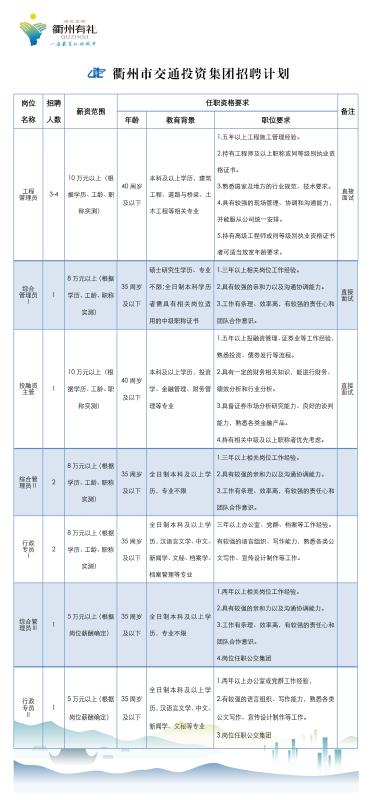 衢州市交通投資集團(tuán)有限公司根據(jù)集團(tuán)發(fā)展需要,擬面向社會(huì)公開招聘工作人員,具體工作單位由集團(tuán)根據(jù)工作需要,在集團(tuán)本部和全資子公司之間進(jìn)行統(tǒng)籌安排。具體招聘事項(xiàng)安排如下: