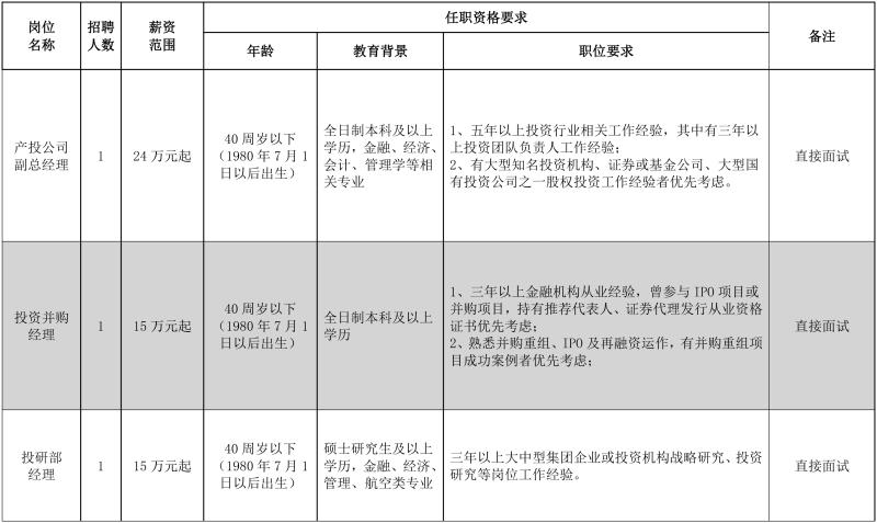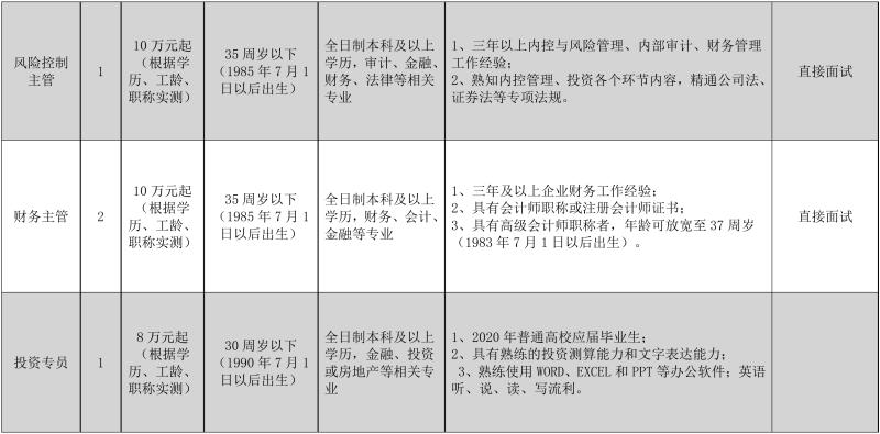 2、產(chǎn)投公司副總經(jīng)理、投資并購經(jīng)理、投研部經(jīng)理、風(fēng)險(xiǎn)控制主管、財(cái)務(wù)主管五個(gè)崗位采用直接面試形式,報(bào)名人員通過資格審查后進(jìn)入面試環(huán)節(jié)。
