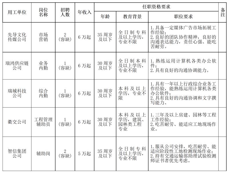 擬招聘市場(chǎng)營(yíng)銷2名、業(yè)務(wù)內(nèi)勤1名、綜合內(nèi)勤1名、工程管理輔助員1名、子公司試驗(yàn)檢測(cè)輔助員2名,用工性質(zhì)為勞務(wù)派遣。